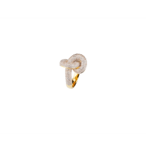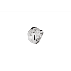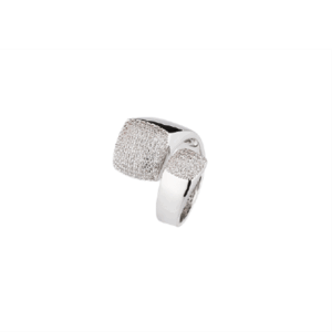 Anello aperto in ottone con finitura rodio e zirconi, incrociato.