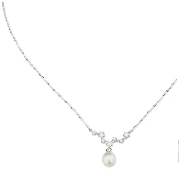 Collana in argento e perle di fiume con cubic zirconia. Cm 46