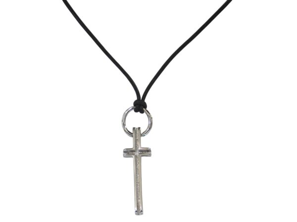 Collana cuoio con croce sottile in argento e scanalatura centrale più opaca.