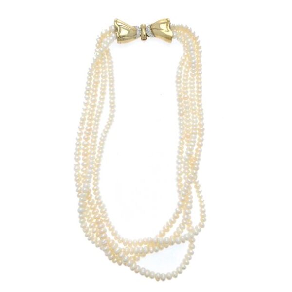 Collana 4 fili di perle di lago con chiusura in argento dorato e zirconi