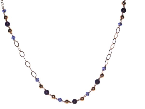 Collana con pietre assortite sui toni del viola e rosa in argento placcato oro.