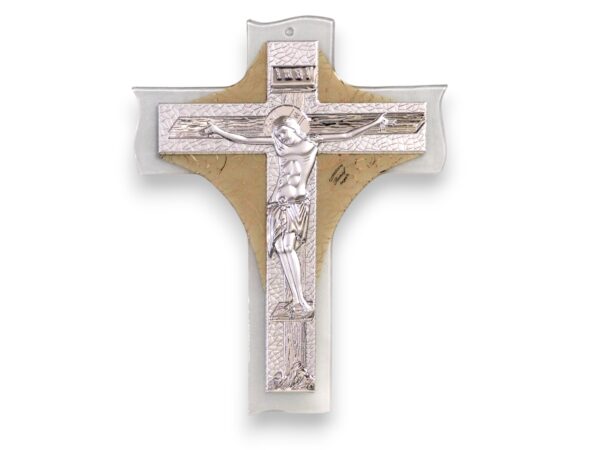 Crocifisso in vetro opaco con riporto color oro come sfondo.
