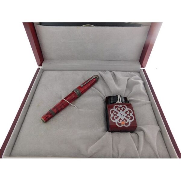 Penna Aurora edizione limitata ” 85° anniversario”. Stilografica in auroloide e argento massiccio con incisioni floreali. Testina ovoidale con mosaico incastonato, logo in madreperla grigia e fondo in pasta corallo. Parte lenticolare in cristallo di rocca. Edizione limita a 1919 esemplari ( n. 1017/1919)