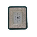 Sveglia con cornice in argento bilaminato 925 con ghirigori in rilievo, su base di velluto bordeaux.